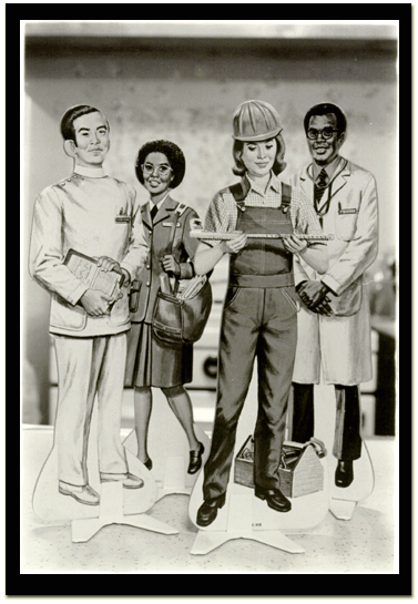 Photograph of "Our Community Helpers," cardboard stand-up Play People, circa 1975